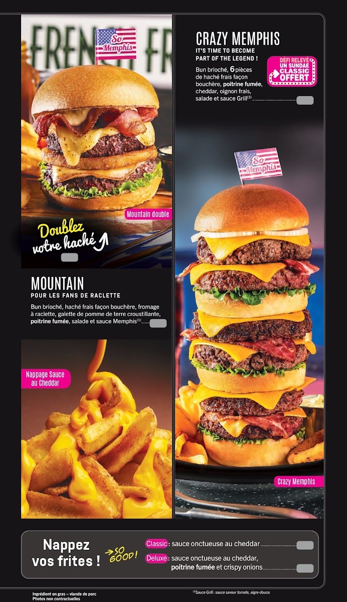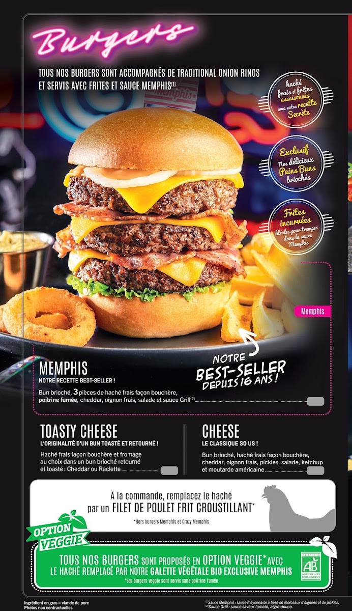 Bun noir, haché frais façon bouchère, sauce au cheddar blanc intense, poitrine fumée, oignons rissolés, sauce barbecue fumée, pickles, salade. Servi avec traditional onion rings, frites et sauce Memphis.