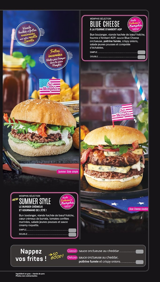 Bun brioché, haché frais façon bouchère, fromage à raclette, galette de pomme de terre croustillante, poitrine fumée, salade et sauce Memphis.